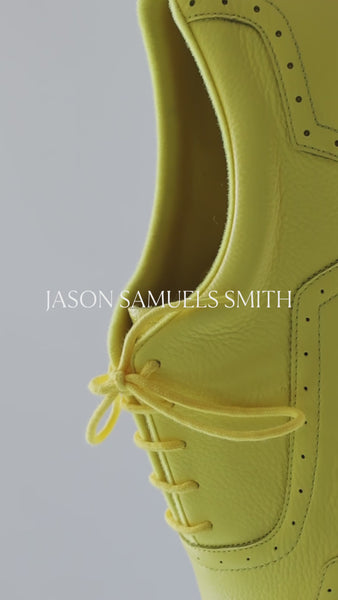 This is Bloch's professional tap shoe designed with tap icon Jason Samuels Smith now in Yellow. It features a Yellow Pebble leather upper lined with cashmere to reduce moisture and a double hard leather outsole with triple stacked heel. Steel resonance plates between tap and outsole create optimum depth and pitch of sound. Specially developed metal bonding procedures ensure that screws will not loosen without modification. The heel measures 1.5" and separate slip pads are included. Fitting information: If you want a very snug fit choose your street shoe size, otherwise start up 1 size. Get yours before they sell out!